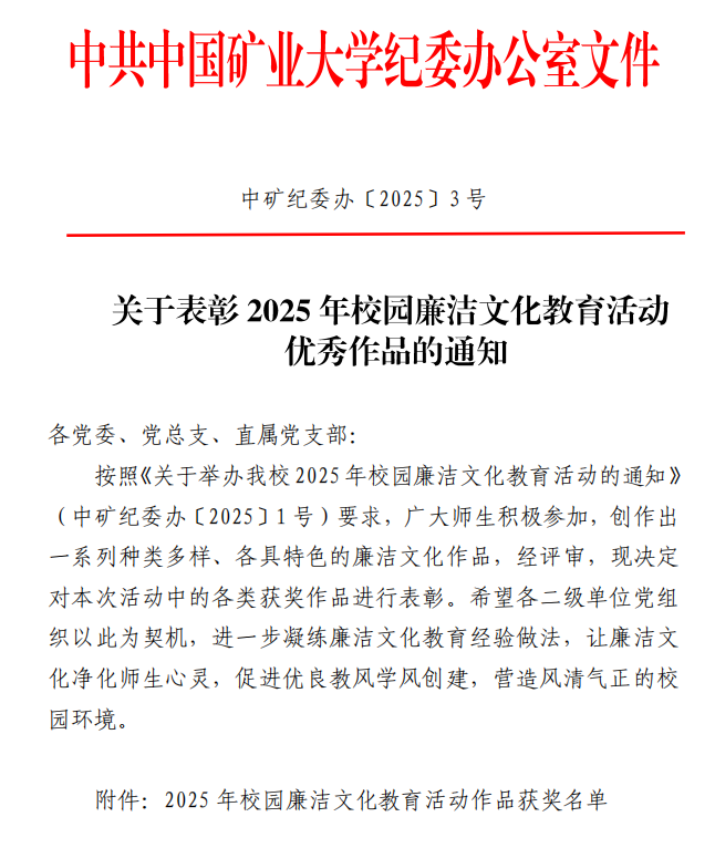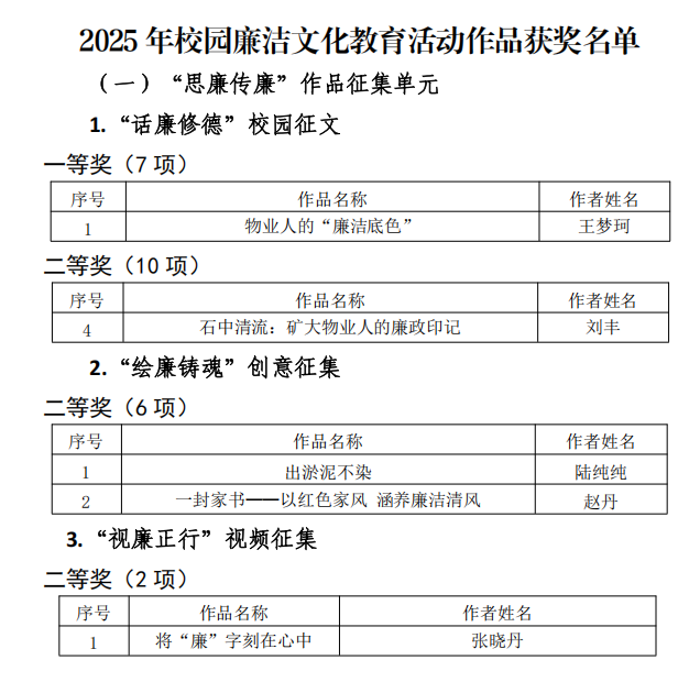 近日,学校公布了2025年校园廉洁文化教育活动的获奖作品。由总务部选送的5份作品均获得学校表彰,其中银河物业职工王梦珂作品《物业人的“廉洁底色”》获征文类一等奖,其余4份作品均获得二等奖。