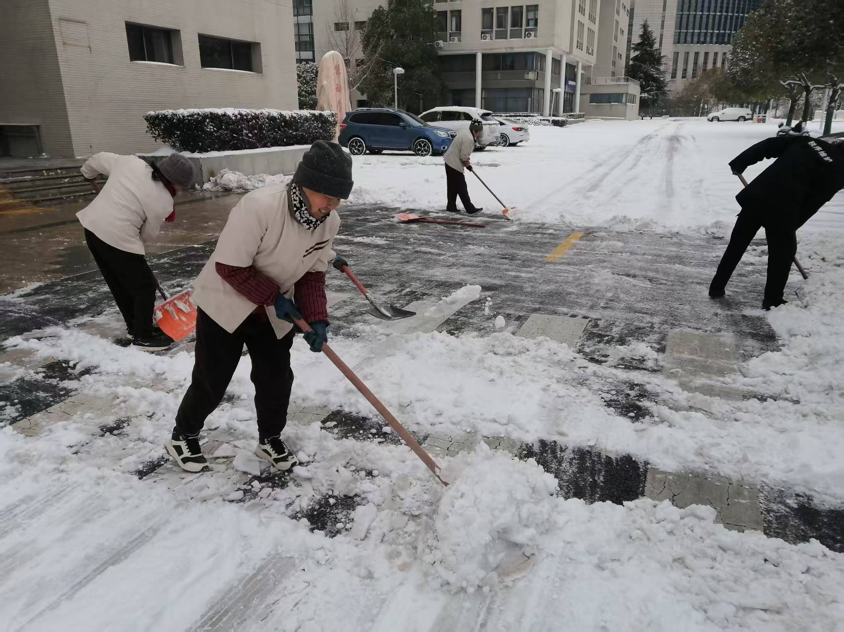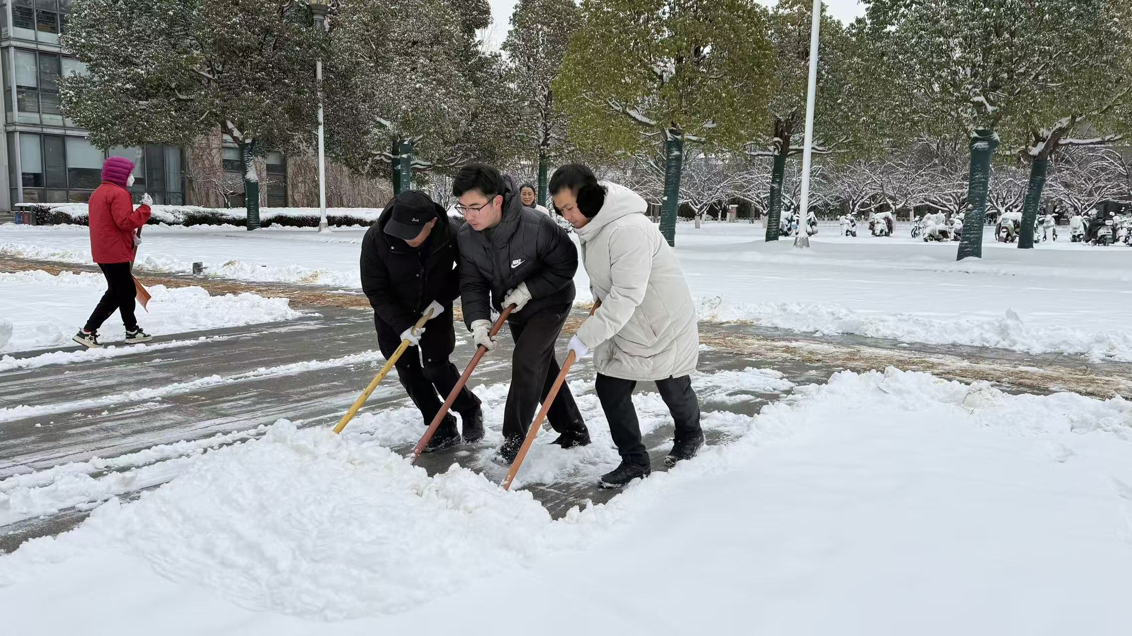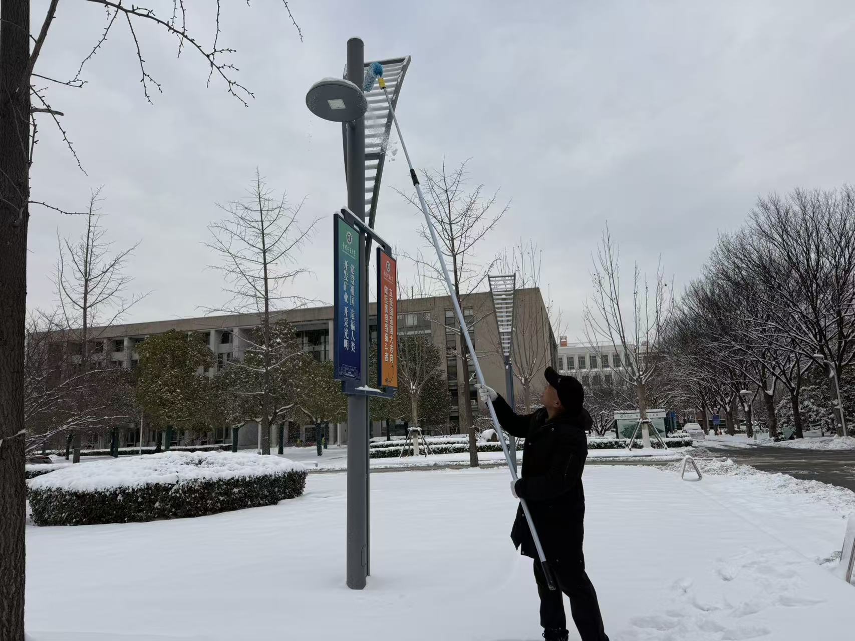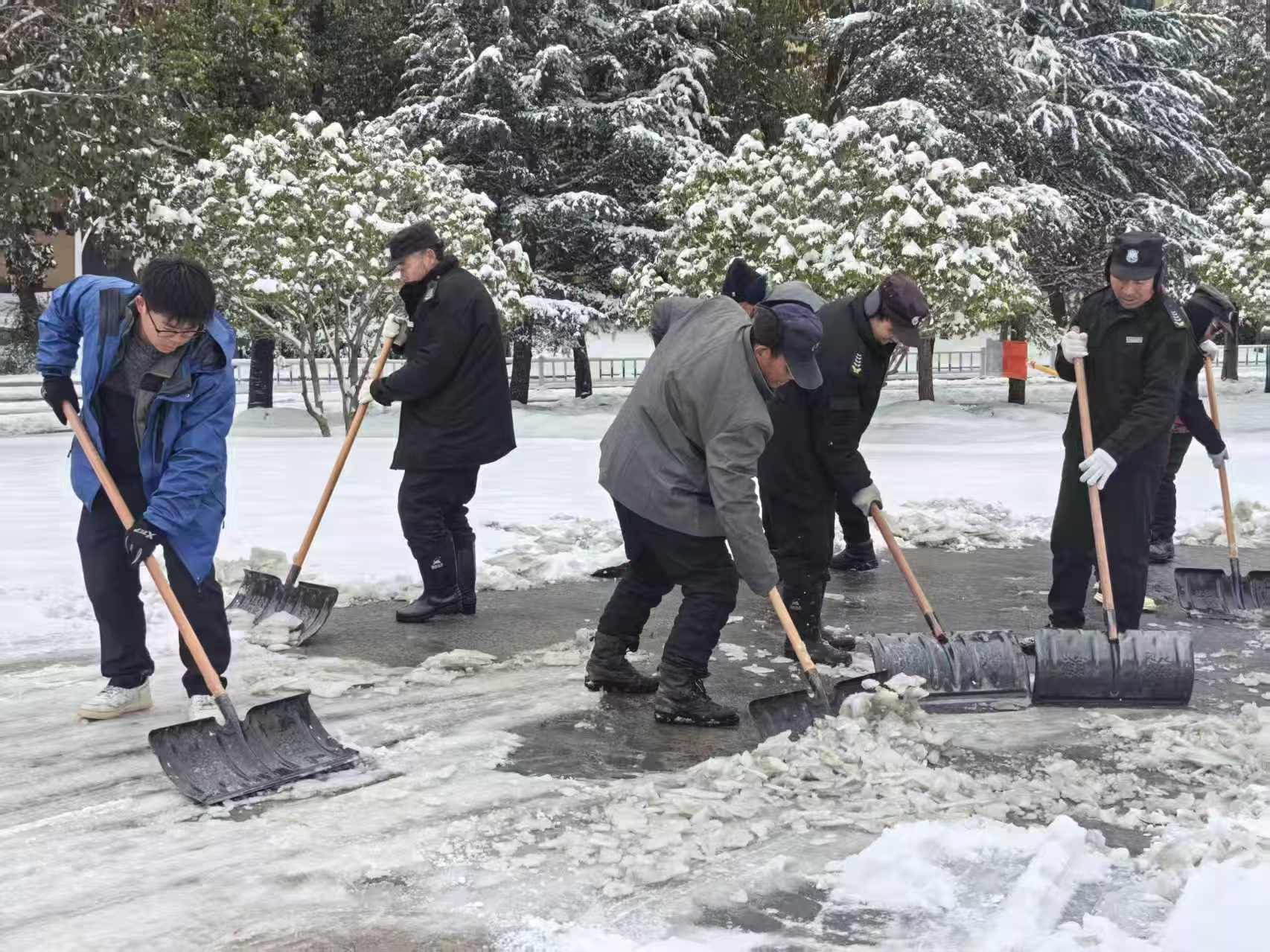 凛冽寒风中,总务人连续奋战数小时,至上午10时许,学校各主要路段、楼宇出入口等重点区域积雪均已清扫干净,校园通行秩序恢复如常,为留校师生后续的学习生活提供了安全便捷的出行保障。
