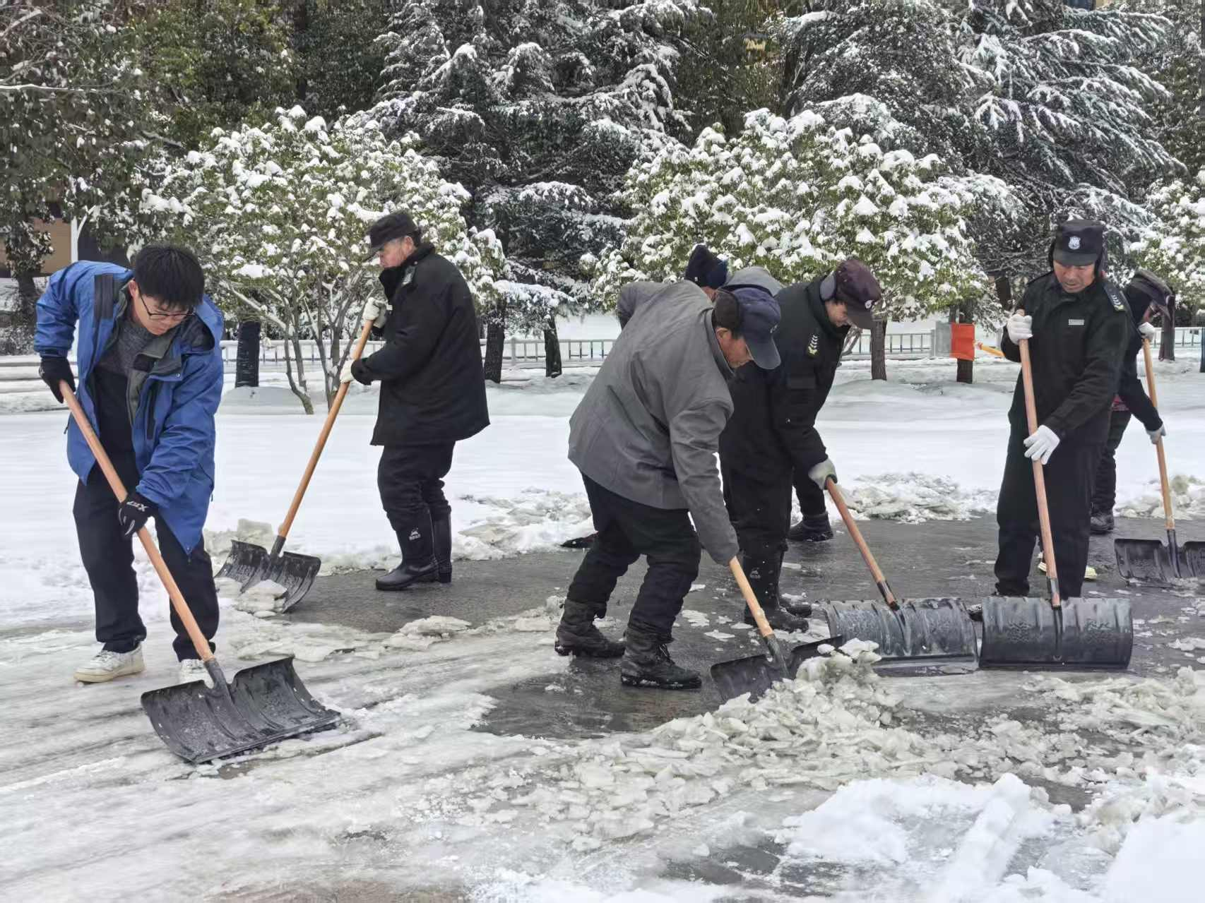 宿管阿姨24小时在岗值守,每日细致核对留校住宿人数,对空房间逐一检查并关闭水电;暴雪刚停,后勤人一大早就开始铲冰除雪,撒融雪剂、铺防滑垫,主干道很快就被清理完毕,确保大家出行不打滑,即使是冻裂的水管也能在1小时内完成抢修,总务部始终坚持用高效响应守护师生居住安全。