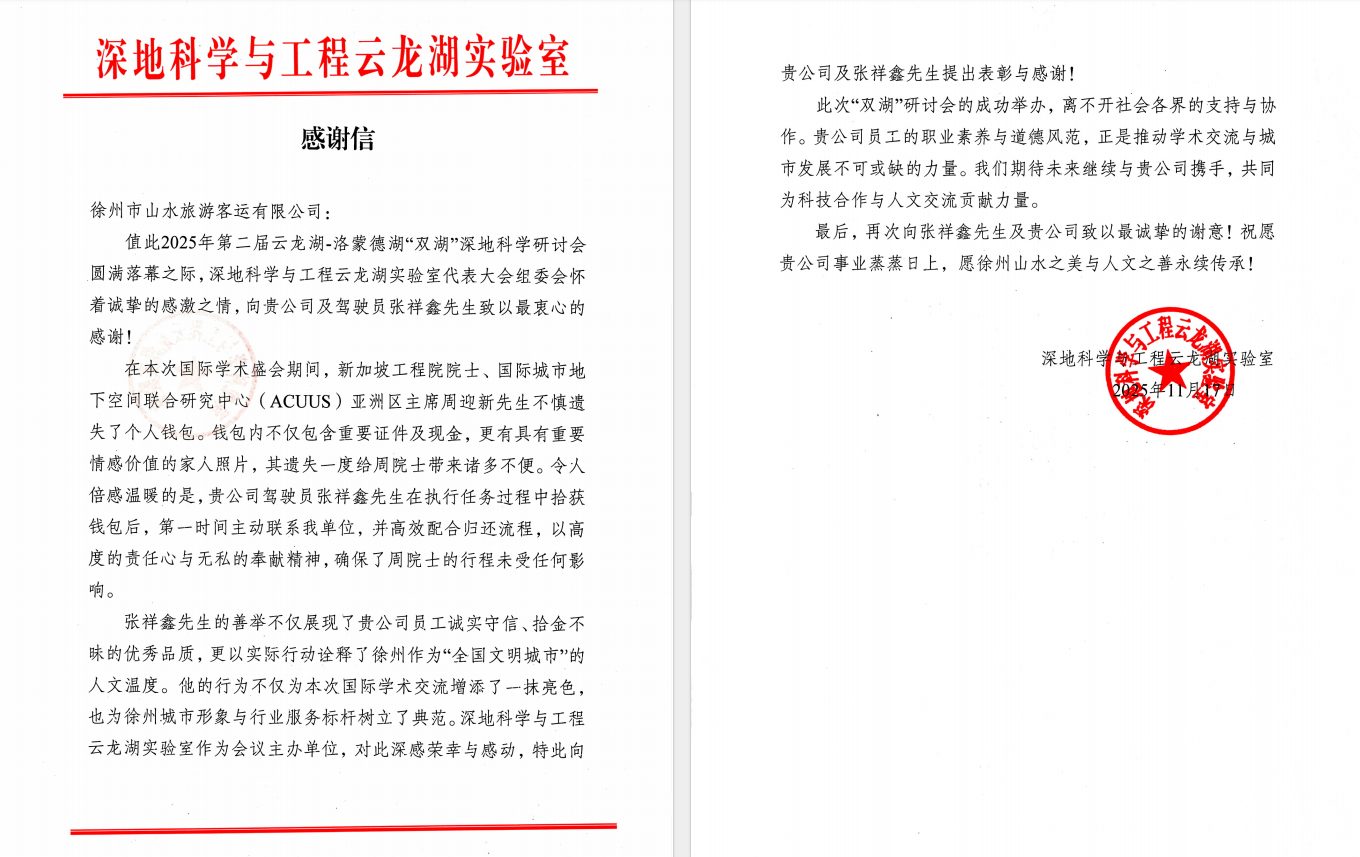 近期,徐州市山水旅游客运有限公司因接连涌现拾金不昧善举备受赞誉:不仅在2025年第二届云龙湖—洛蒙德湖“双湖”深地科学研讨会上,驾驶员张祥鑫拾获新加坡工程院院士周迎新钱包证件并高效归还,获深地科学与工程云龙湖实验室正式致信感谢;更在日常运营中多次帮助学生找回遗失物品。这离不开公务用车管理办公室长期以来的精准化、常态化监管,为企业服务质量与文明素养提升筑牢坚实根基。