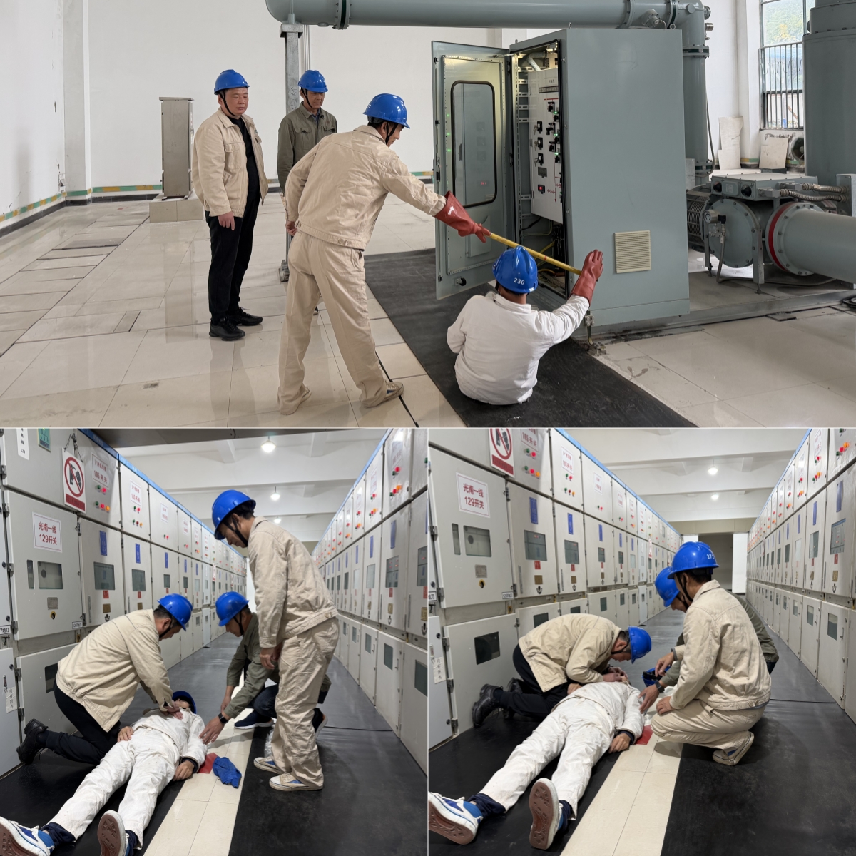 110kV变电站运行班组则针对高压作业的特殊安全风险,组织开展了高压触电急救专项演练。演练模拟真实触电事故为场景,全过程还原应急处置流程。班组以假人为道具,模拟高压触电情况下出现呼吸心跳骤停、肌肉痉挛等症状,现场人员发现险情后第一时间呼救并报告,班组迅速启动应急预案。救援人员严格遵循“先断电、再施救”原则,使用绝缘工具使触电者脱离带电体,避免跨步电压伤害,随后对触电人员进行呼吸心跳检查,立即实施心肺复苏,同时拨打120急救电话并安排专人引导救护车。演练过程中,班组人员严格执行绝缘防护规范,分工配合,有序开展急救操作,有效提升了班组在日常高压环境下操作的专业性和安全性,为保障作业人员生命安全提供了有力支撑。